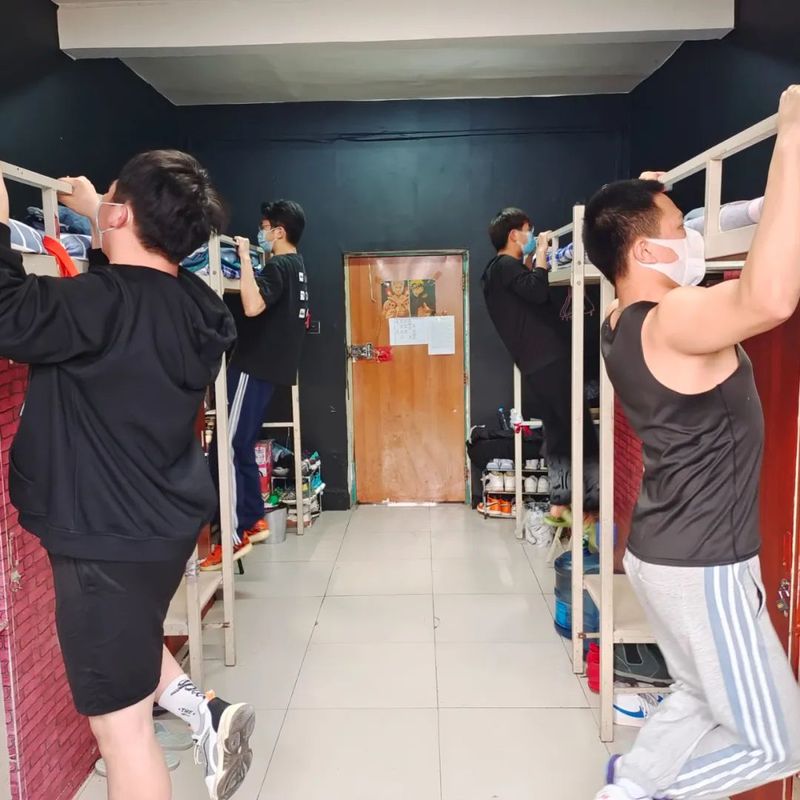 环艺D315寝室锻炼热情高涨,寝室四人比赛做引体向上。