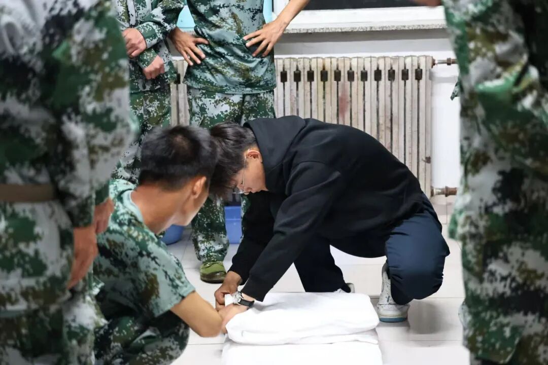 活动现场,教官们分批次在各自寝室演示叠“豆腐块”的完整流程。他们在寝室地面铺平被子,以手掌和膝盖反复压实,用手掌精准丈量尺寸,对被子进行对称折叠,手指发力抠出直角,力度均匀地捏出棱角,很快一床棱角分明、方方正正的“豆腐块”便呈现在新生眼前。随后,教官们分步骤拆解教学,从铺平、压实到翻折、抠角、捏线,每一个环节都细致讲解,让新生近距离观摩学习。