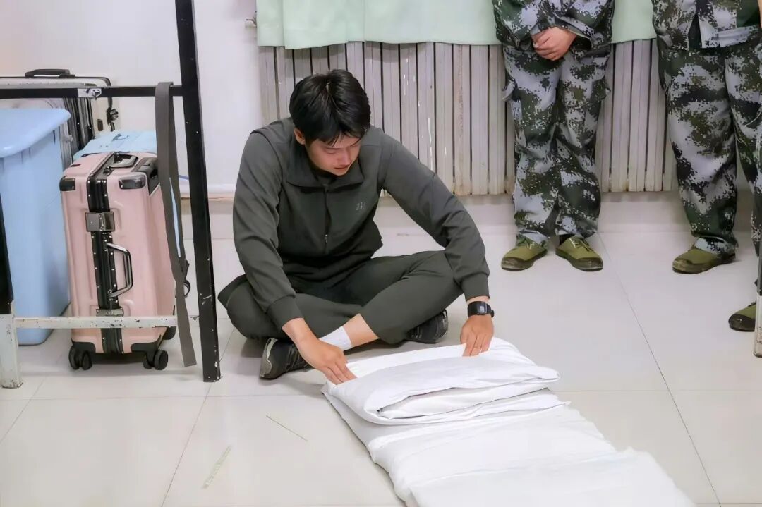 活动现场,教官们分批次在各自寝室演示叠“豆腐块”的完整流程。他们在寝室地面铺平被子,以手掌和膝盖反复压实,用手掌精准丈量尺寸,对被子进行对称折叠,手指发力抠出直角,力度均匀地捏出棱角,很快一床棱角分明、方方正正的“豆腐块”便呈现在新生眼前。随后,教官们分步骤拆解教学,从铺平、压实到翻折、抠角、捏线,每一个环节都细致讲解,让新生近距离观摩学习。