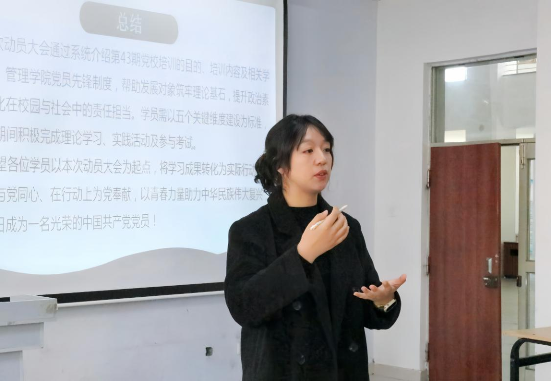 为深入学习习近平新时代中国特色社会主义思想,开展党的二十届三中全会精神教育培训,进一步认真落实新时代党的建设总体要求与组织路线,帮助发展对象筑牢思想根基、明确成长方向,2025年10月21日中午11点40分,在管理楼104教室举行第43期党校培训班——bwin必赢动员会。公司党总支书记张喜希、辅导员卜怡凡及第43期全体学员共同参加会议。