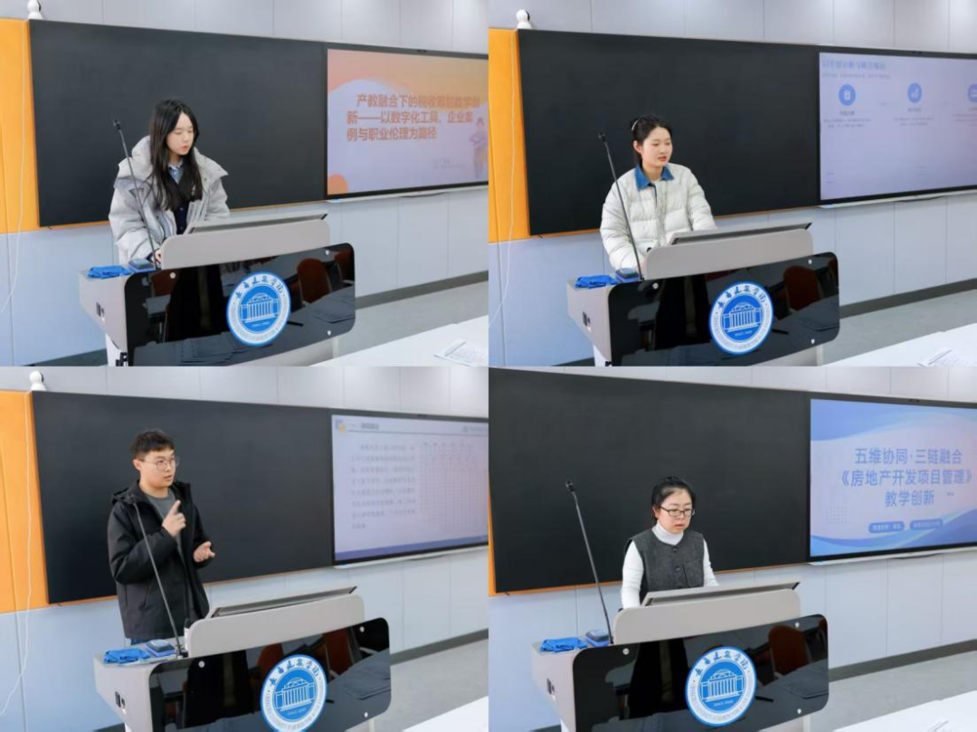慕童老师主要为财务管理的教学进行设计,突破传统单一要素,用数字化工具落地实战案例,跟紧产业链与创业链,将理论与实践融合,建立可依托的“校企协同平台”。肖迪老师将AI赋能OBE教学革新带入管理学,利用AI对员工进行分层教学,实现个性化巩固,利用AI让员工的学习效率和教学质量都得到提高。朱松老师对建筑施工教学进行了改进,利用广联达虚拟施工系统与 Bimfilm 软件对本门课程进行助力,利用动画进行演示,让员工更加清楚的了解建筑施工的过程和检验流程。逄旭老师通过五维协同和三链融合,对房地产开发项目管理进行教学创新,通过对核心课程的讲解,以真实项目为载体,打破传统壁垒,实现从知识灌输向能力塑造转变,结合未来优化方向进行改革教学方式。郝仪兰老师将OBE技术带入会计学原理,利用实践性和管理性相结合的方法设定教学目标,将会计工作走进课堂,将复杂的概念形象化组织跨学科知识交流活动。